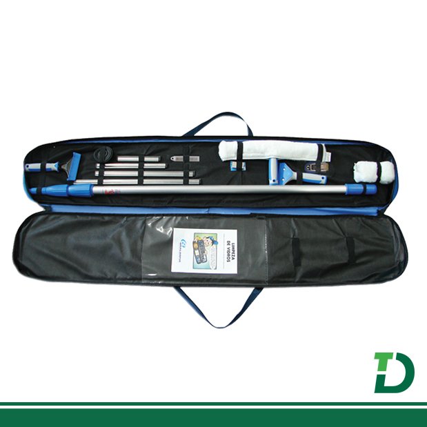 • Permite ao usuário promover a limpeza de vidros com diversos tipos de sujidades e em várias situações de locais e alturas • Bolsa em nylon resistente, com diversas divisórias para acondicionar e proteger os equipamentos, além de facilitaro trabalho e o transporte. • O uso de extensões diminui drasticamente os acidentes com andaimes e escadas, além de prevenir a DORT/LER |