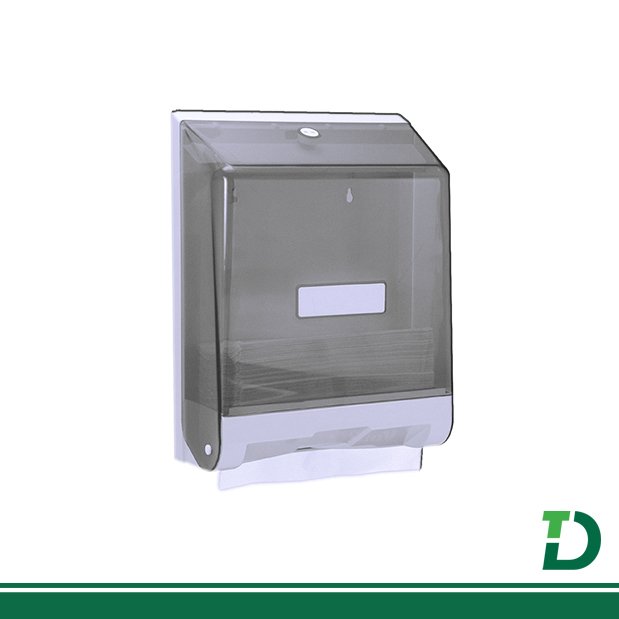 Descrição: Toalheiro para papel interfolha 2 ou 3 dobras injetado com a frente em plástico ABS cristal e fundo em Plástico ABS branco.